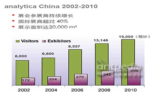2010年9月15-17日,上海新國際博覽中心在時隔2年后將又一次迎來亞太地區分析、生物技術、診斷和實驗室技術領域的頂級盛會,第五屆慕尼黑上海分析生化展(analytica China)將攜手來自22個國家和地區的近450家國內外頂尖企業,為約15,000名到場觀眾展示最新科學儀器、尖端分析測試技術,提供全方位的實驗室技術解決方案。此次展會規模超20,000平米,展會面積同比增長了18%,再次刷新自2002年以來的最高紀錄。同時,國際化程度也創新高,共有來自19個國家的180多家國際領先企業參展,其中,德國、日本、英國和澳大利亞組織了大型國家展團將集體亮相,國際展商比例高達近40%。