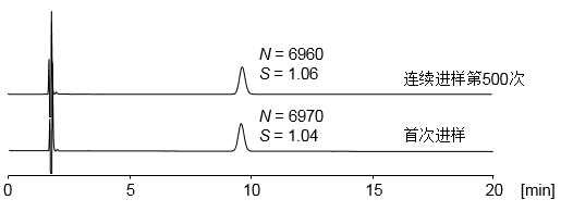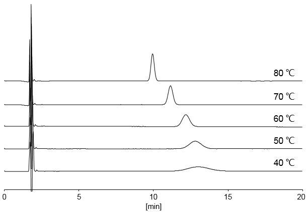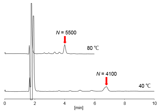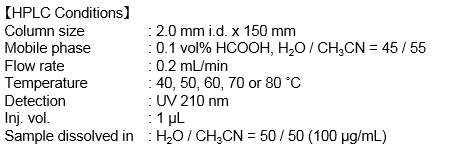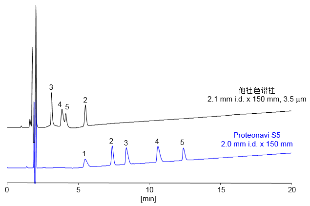 Espresso系列 ~第二彈~ 大家有沒有想過,把一支色譜柱加熱到80℃會發生什么。。。為了好奇的同學們,YoYo老師今天將為大家帶來Espresso系列第二彈~ ↓↓↓ PS: Espresso系列是由大阪曹達日本實驗室提供的干貨數據,不定期更新嗷~ ●●● Proteonavi S5的溶出行為2 & 3 ~與他社色譜柱的比較及柱溫80℃下的耐久性及峰形考察~ Keywords :Proteonavi, 肽類, 緩激肽, 后葉催產素, 血管緊縮素II, 神經降壓素, 血管緊縮素I, 環孢菌素A, 表面活性肽, 0.1 vol% HCOOH, 柱溫80℃, 耐久性, 峰形 ~與他社色譜柱的比較~ ProteonaviS5是一款以孔徑為30 nm的硅膠作為基材、鍵合C4基團的蛋白質?肽類化合物分析色譜柱。 上回的Espresso中介紹了以6種蛋白質作為樣品,將Proteonavi S5與他社色譜柱進行溶出行為的比較的試驗。(Proteonavi S5的溶出行為1~與他社色譜柱的比較~) 本次,我們以5種肽類化合物(緩激肽、后葉催產素、血管緊縮素II、神經降壓素及血管緊縮素I)作為樣品,將Proteonavi S5與一款填料表面帶有正電荷的他社雜化型色譜柱(孔徑13 nm、粒徑3.5 μm)的溶出行為進行比較,所得結果見圖1。 ▲圖1 兩款色譜柱分析所得色譜圖 其中,流動相條件為添加0.1 vol%甲酸的水-乙腈系統,在梯度條件下進行分析,對這兩款色譜柱進行了溶出行為的考察。 如圖1,他社色譜柱對5種肽類化合物的整體保留較弱,且緩激肽峰未能得到確認(被吸附而未能溶出);與此相對,Proteonavi S5對這5種肽類化合物均得到了良好的色譜峰形及充分的保留與分離。 ~柱溫與溶出行為~ 對肽類化合物進行分析時,有提高柱溫的做法。例如,《第17改正日本藥局方》中,環孢菌素是在柱溫80 ℃附近的一定溫度下進行分析的。 在此,以環孢菌素A作為原料,在等度條件下對色譜柱柱溫變化及相應的溶出行為進行了考察。圖2為所得結果。 環孢菌素A (M.W. 1202.6) Cyclosporin A ▲圖2 柱溫與環孢菌素A溶出行為的關系 如圖2,隨著柱溫的上升,環孢菌素A的保留逐漸減弱,峰形也愈發尖銳。 一般,與小分子相比,大分子的擴散速度較慢,因此色譜峰形有展寬的趨勢,而設定較高的柱溫可以使峰形變得尖銳。 就像這樣,常規情況下,在對肽類化合物進行分析時,設定較高柱溫可以使分析時間縮短,并提高定量準確性。(敲黑板!) ~80℃下的耐久性考察~ 接下來,在柱溫80 ℃條件下對Proteonavi S5的耐久性進行了考察。 圖3為首次進樣與連續進樣第500針所得色譜圖,圖4為進樣500針的環孢菌素A保留時間維持率(%)。 ▲圖3 首次進樣和連續500次進樣所得色譜圖 ▲圖4 環孢菌素A的保留時間維持率(%) 如圖3、4,對Proteonavi S5進行80?C條件下的連續耐久性試驗,在連續500次進樣過程中(通液時間共計250小時),環孢菌素A的峰形幾乎沒有變化(理論塔板數N及對稱因子S),同時,保留時間維持率近乎100%(首次進樣與第500次進樣對比,具體數值為99.4%)。 綜上,Proteonavi S5色譜柱即使在80 ℃的高柱溫條件下也能得到非常穩定的分析結果。 *耐久性評價方法是將首次進樣的保留時間視為100%,將連續進樣第500次的保留時間與其對比,計算維持率(%)。 *理論塔板數、對稱因子的計算方法根據《第17改正日本藥局方 解說書》進行。 對于環孢菌素A這樣的大分子化合物,隨著柱溫的上升,其擴散速度加快,因而峰形會更尖銳。 進一步,針對提高柱溫的效果,以環狀肽類化合物表面活性肽(M.W. 1036.3)作為分析對象,將柱溫分別設定為40 ℃和80 ℃進行分析,圖5為分析所得結果。 表面活性肽 (M.W. 1036.3) Surfactin ▲圖5 柱溫40 ℃及80 ℃條件下 對表面活性肽的分析色譜圖 色譜耗材·年終鉅惠納譜分析年終放“價”匠心“柱”力科研納譜分析年終大促火熱開啟,多款熱門產品直擊冰點價,更有多重豪禮相送!讓你省心又省錢!福利1——新客專享買1贈1免費試用先試后買?BioCore系列...... 2025年6月24日,東曹生命科學以煥然一新的品牌形象盛裝亮相CPHI&PMECChina展會W5實驗室儀器與設備館。此次參展,東曹展示了其全新品牌口號“CONNECTINGMINDS.TOU...... ★★★科研人、檢測人注意啦!近日,YILIMART宣布:沃特世(Waters)全系列色譜柱及消耗品正式入駐YILIMART平臺!作為全球分析技術領域的佼佼者,沃特世品牌在生命科學、材料科學和食品科學等...... 硅膠顆粒在高pH條件下的溶解問題硅膠作為高效液相色譜柱的填料基質,盡管被廣泛采用,但其性能并非完美無缺,存在一些固有的缺陷。通常認為,當硅膠填料長時間持續暴露在pH>8的環境中,硅膠骨架可能會發...... 色譜柱的發展,經歷了從不定型硅膠到高純球型硅膠、從低pH條件下不穩定到穩定的過程。但硅膠在高pH條件下極度不穩定的問題,始終沒有很好的解決方案,直到雜化顆粒技術的誕生。雜化顆粒集合了有機和無機填料的優...... 10月16日消息,國家知識產權局信息顯示,常州三泰科技有限公司取得一項名為“一種可變體積的固體上樣色譜柱”的專利,授權公告號CN221831730U,申請日期為2024年2月。專利摘要顯示,本實用新型...... 一維氣相色譜(1D-GC)固定相通常根據其相對極性分為非極性、半極性和極性柱。在全二維氣相色譜(GC×GC)中,兩個串聯組裝固定相之間的極性差異決定了色譜柱組合的選擇性。這種極性差異稱為正交性,GC×...... 新聞摘要·沃特世成為首個獲得ACT?Ecolabel認證的42種液相色譜柱的供應商,這為沃特世的色譜柱制造、使用、包裝和處理的環境影響提供了獨立驗證。·獲得ACT環境影響因子標簽的實驗室產
