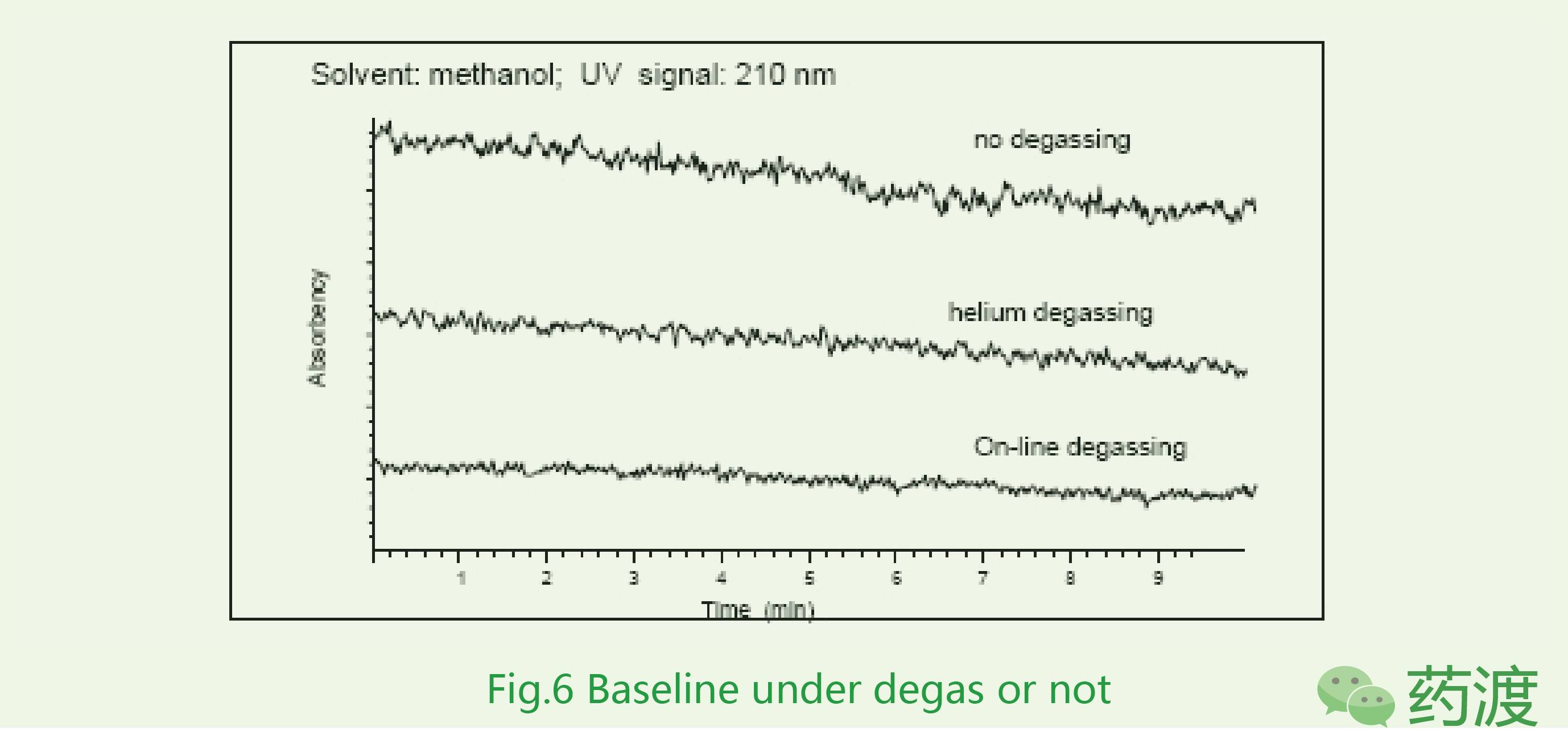 流動相在使用之前確保經過脫氣處理,使用未經脫氣處理的流動相,基線波動比較厲害,噪音水平較高,有時也會出現鬼峰。下圖比較了脫氣與否以及脫氣方式對于基線噪音的影響。