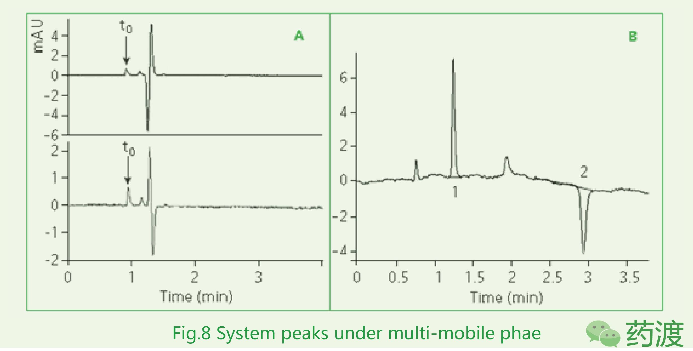 此外,在使用強紫外吸收的添加劑的時候,注意對色譜圖上的系統峰進行區分。如下圖8A所示,0.1%TFA水以及乙腈為流動相,分別進樣比起始流動相洗脫強度弱/強的0.1%TFA溶劑,1-2 min內的正負峰均為系統峰。特別的,當使用其他保留比TFA強的添加劑的時候,如HFBA,需要注意進樣之后引起的系統峰,如下圖8B中峰1以及峰2均為系統峰且峰1與峰2的面積和理論上為零。