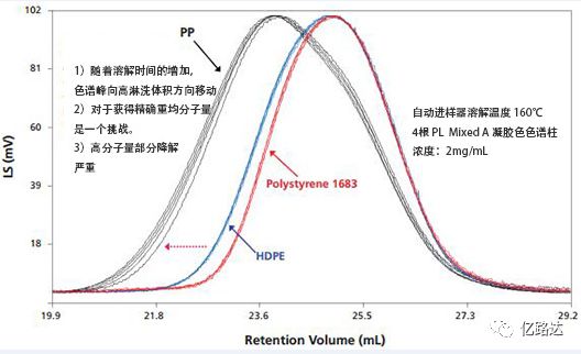 對于比較樣品的好壞或者控制產品質量來說,GPC分析結果的重復性非常重要。那么從樣品制備方面如何保證結果的重復性呢?一般來說,大家會認為自動進樣器只是提高了分析的自動化程度,更加方便。實際上自動進樣器更深層次的意義在于可以提高測試結果的重復性。傳統的樣品制備需要外部溶樣和外部過濾,人為因素較多,樣品外部溶解受熱時間過長且無法真正保證樣品準確的受熱時間,熱降解嚴重(見圖1)[2],嚴重影響測試結果的重復性;西班牙Polymer Char 的GPC-IR只需固體進樣,剩余的過程比如加入溶劑、加熱溶解、過濾、自動清洗等等有儀器完成,采用分區設計,可對每一個樣品設置精確的受熱時間,另外采用氮氣吹掃及溫和震蕩的方式溶解樣品,降低了氧化降解和剪切降解,同時添加流量標記物(流量標記物峰出現分析結束),能夠最大程度地保證測試結果的重復性。